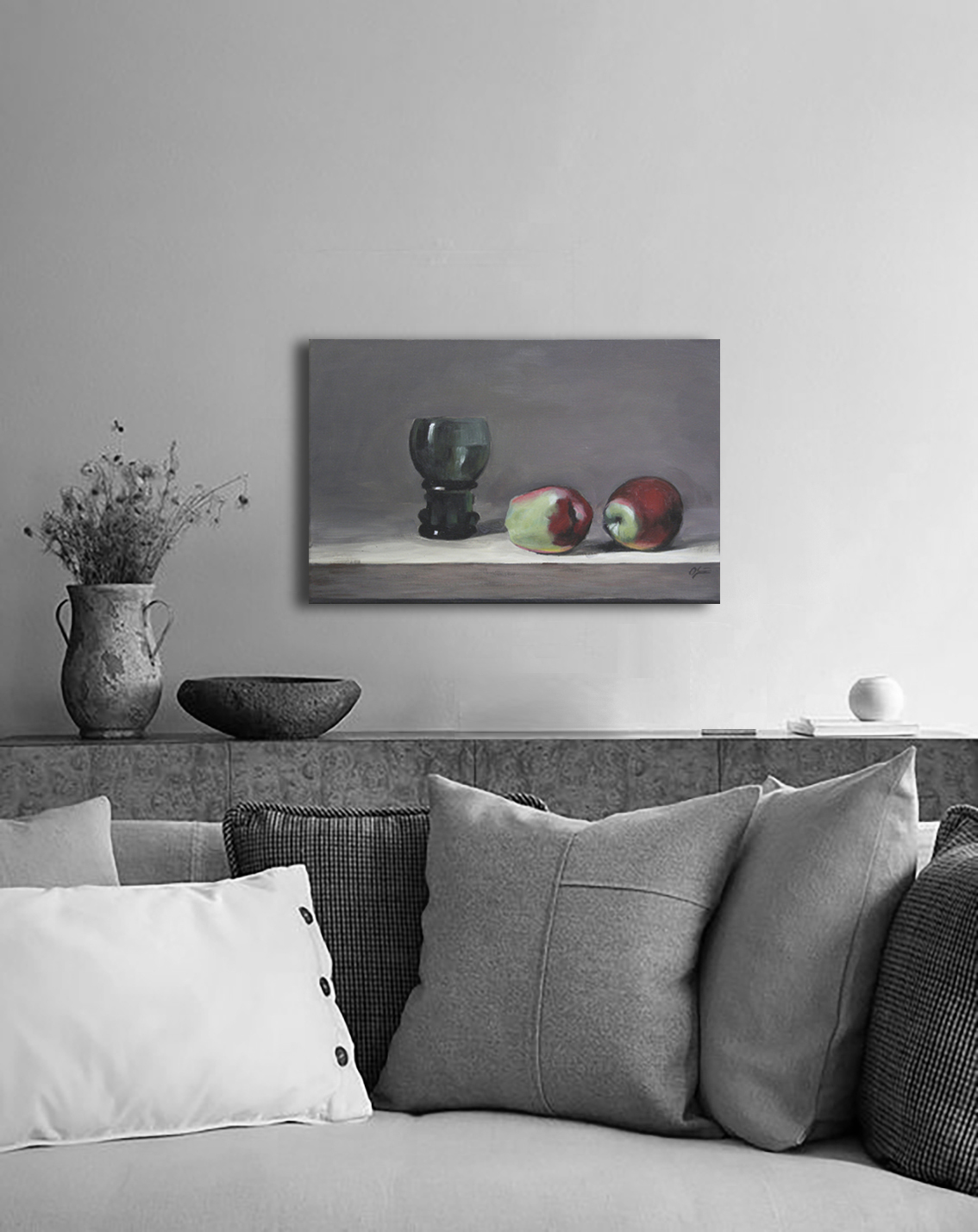 Ein klassisches Motiv in moderner, minimalistischer Interpretation. Das Zusammenspiel von Glas und Frucht wird hier durch ein meisterhaftes Lichtdesign lebendig: Der grüne Glanz des Glases trifft auf das satte Rot und Grün der Äpfel. Eine schlichte, aber wirkungsvolle Szene in warmen Grautönen. Originalwerk (Acryl auf Leinwand) aus der Reihe „Minimalistische Stillleben im silbernen Licht“.